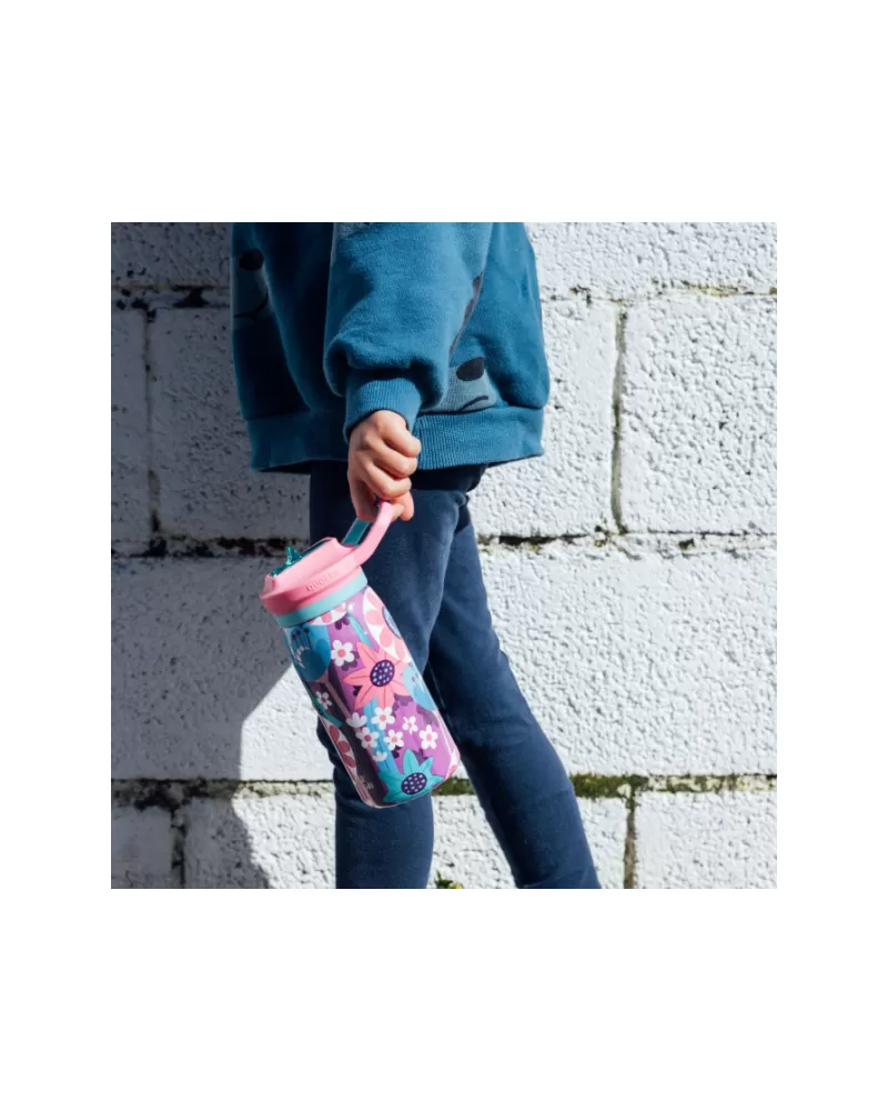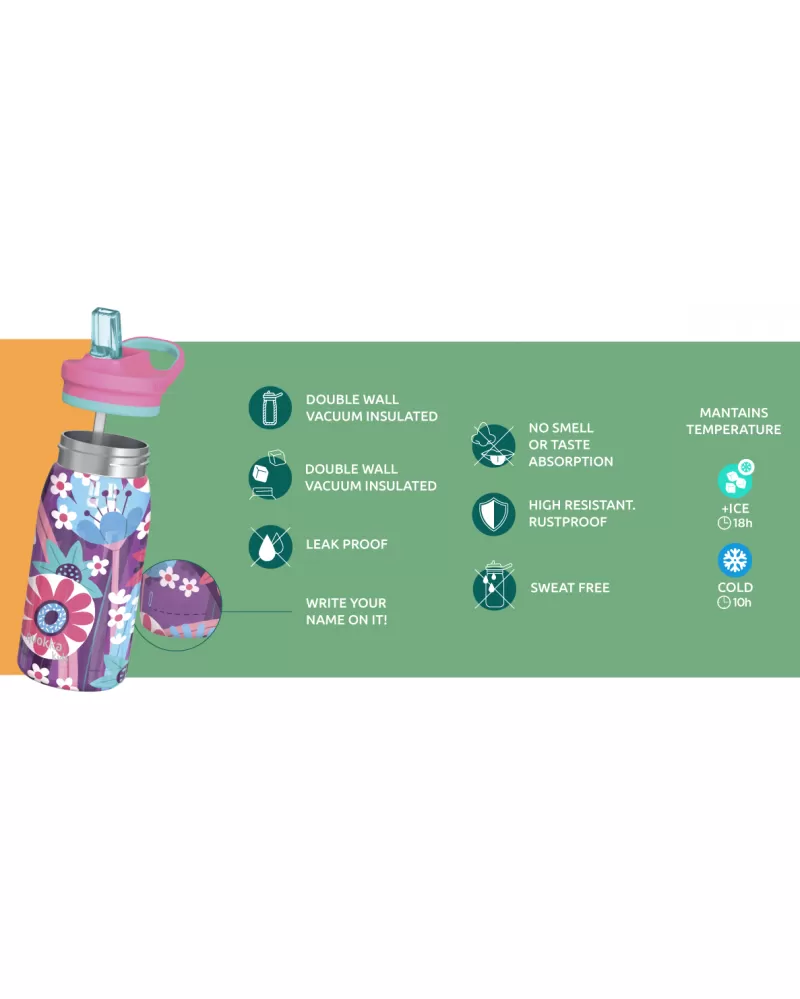 Dětská termoláhev Quokka Pop Kids z vysoce kvalitní dvoustěnné oceli udrží nápoj i během horkých letních dní příjemně studený. Láhev s pítkem a brčkem umožňuje snadné pití bez nutnosti naklánění láhve. Zaklapávací pítko brání vylití obsahu láhve. Široké hrdlo umožňuje vložení kostek ledu a zároveň se díky němu láhev snadno čistí. Údržbu usnadňuje i odnímatelné široké brčko. Díky držadlu se láhev snadno přenáší.