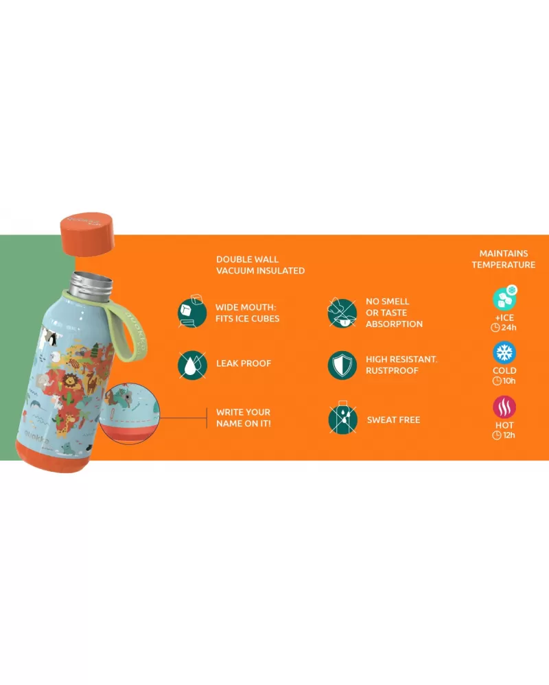 Termoláhev je vybavena poutkem pro snadné přenášení. Na spodní části láhve je prostor pro napsání jména nebo nakreslení obrázku, aby nedošlo k záměně ve školce či ve škole.