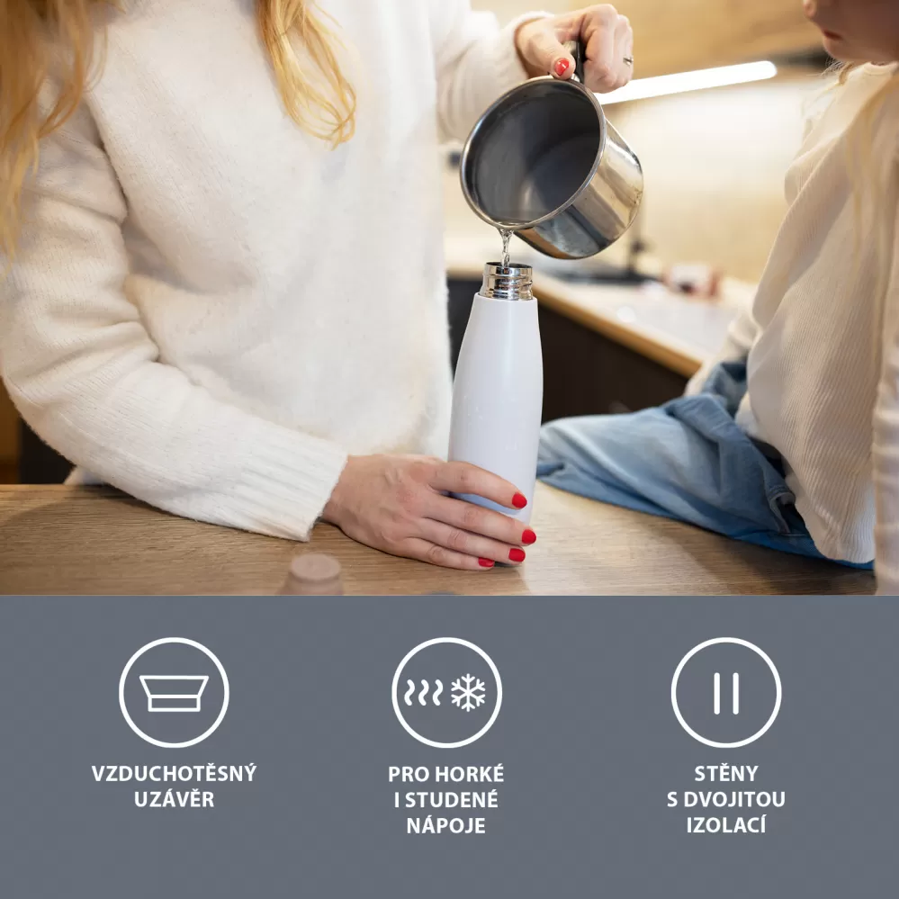Kvalitní termoska na tekutiny o objemu 480 ml uchovává horké nápoje až 12 hodin, studené až po dobu 24 hodin. Je vyrobena z kvalitní nerezové oceli, která je odolná vůči korozi. Těsné víčko zajišťuje, že termoska neprotéká. Díky vakuové izolaci se termoska při naplnění horkou tekutinou nezahřívá z venku. K pohodlnému uchopení je termoska vybavená držákem.