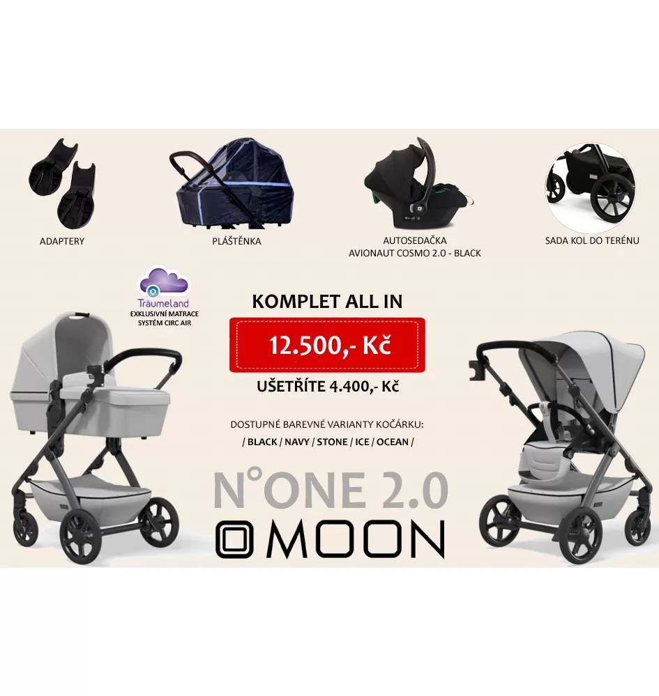 Výhodný set N ONE 2.0 Black obsahuje dvojkombinaci kočárku, autosedačku COSMO BLACK, adaptér, pláštěnku, exkluzivní matraci Träumeland, držák na pití, druhá sada velkých gumových kol vhodná do terénu