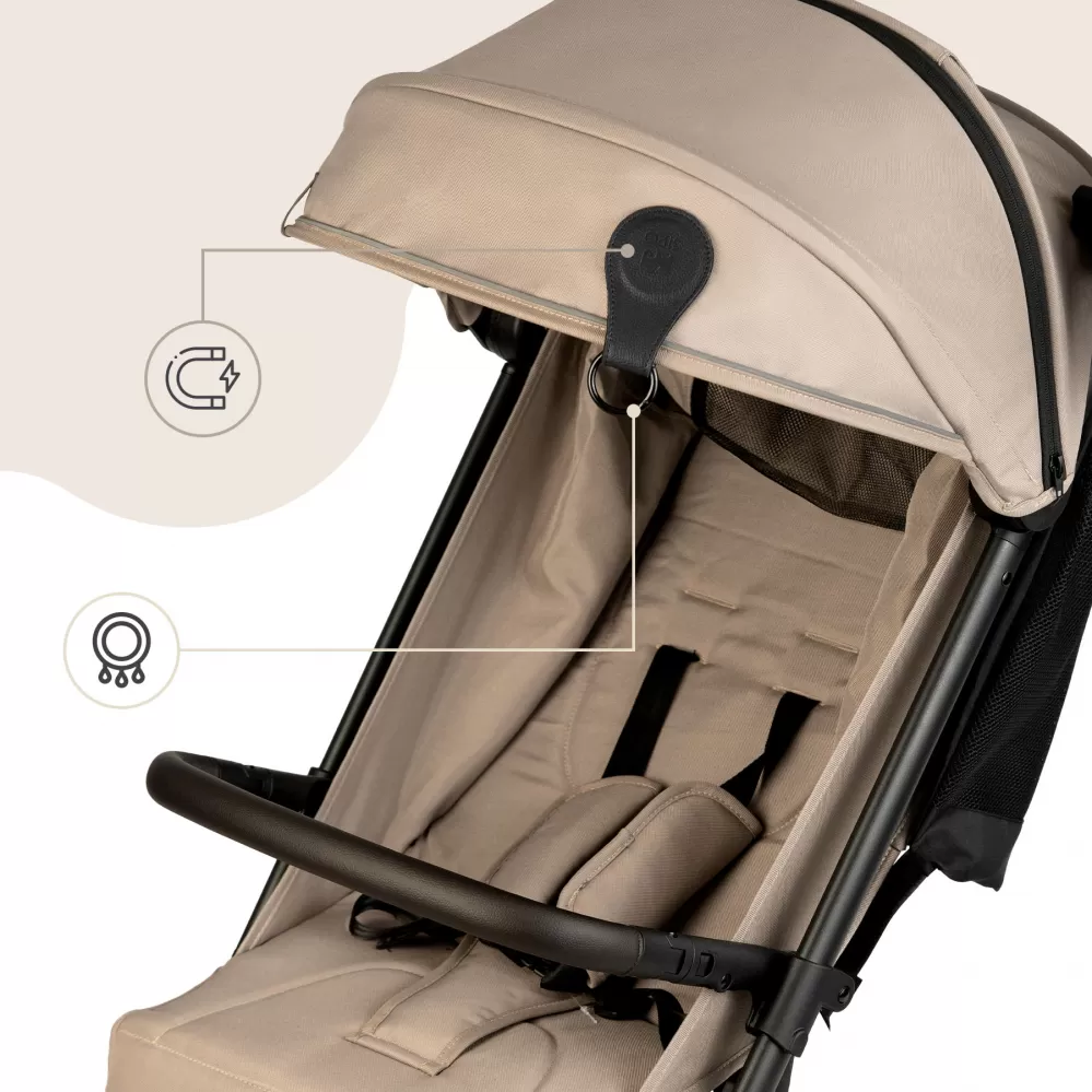 Doporučeno pouze pro použití s lehkými, prodyšnými látkami, které neomezují proudění vzduchu kolem dítěte – jako je bavlna, mušelín nebo síťovina. Úplné zakrytí kočárku vzduchotěsnými materiály může způsobit přehřátí a nedoporučuje se. Pokud jsou spony znečištěné, lze je otřít vlhkým hadříkem – nepoužívejte agresivní čisticí prostředky. Není vhodné pro praní v pračce ani mytí v myčce nádobí.