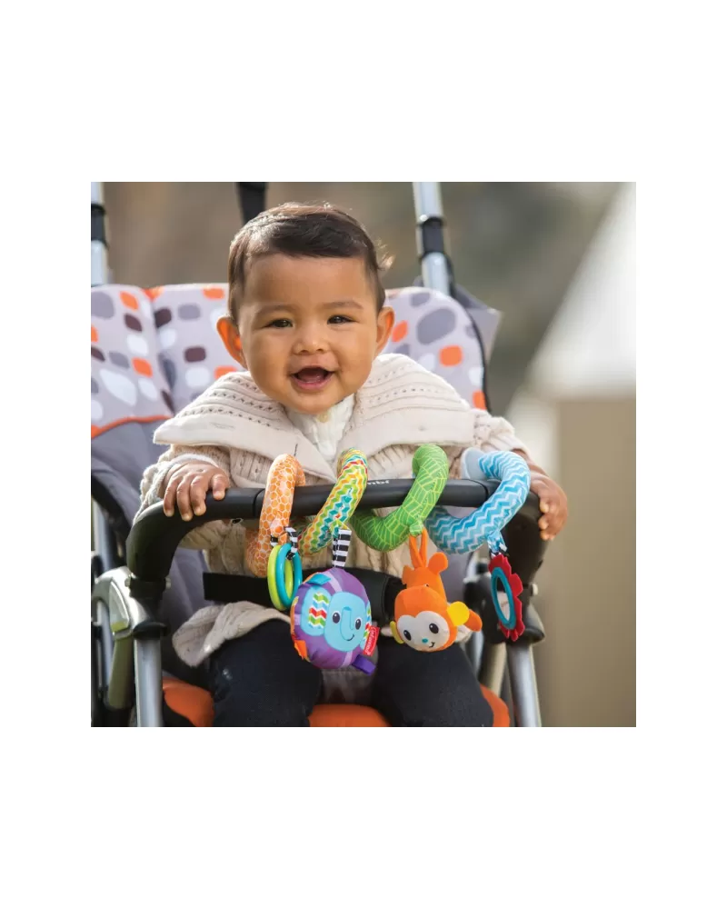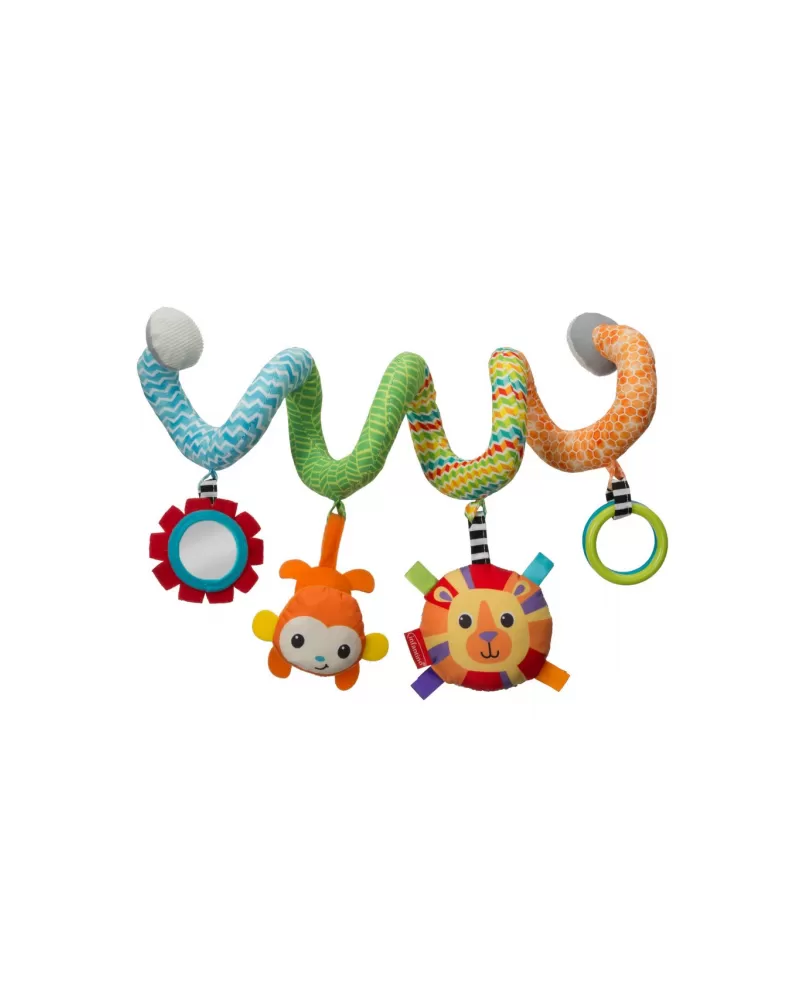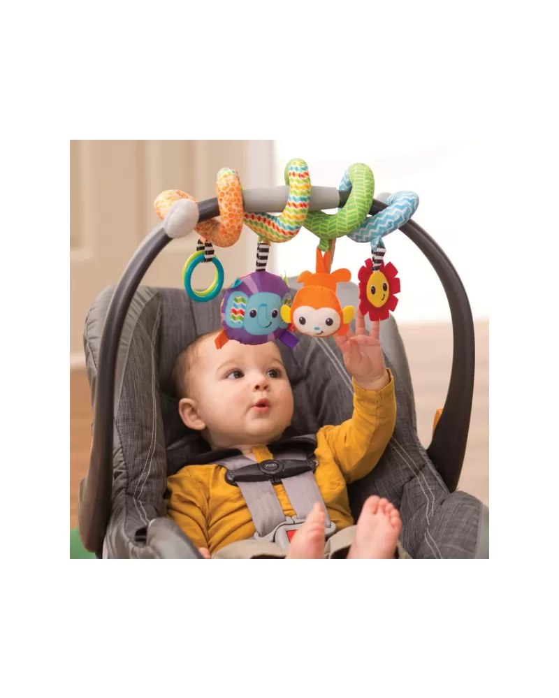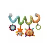 Spirálu snadno připevníte k madlu kočárku, autosedačky či na postýlku. Zavěšené chrasticí a šusticí hračky ve výrazných barvách upoutají pozornost dítěte a pomáhají rozvoji jeho smyslů.