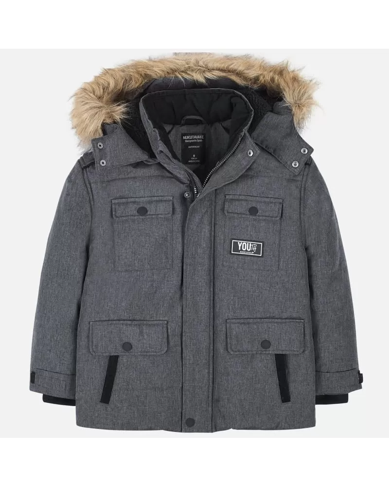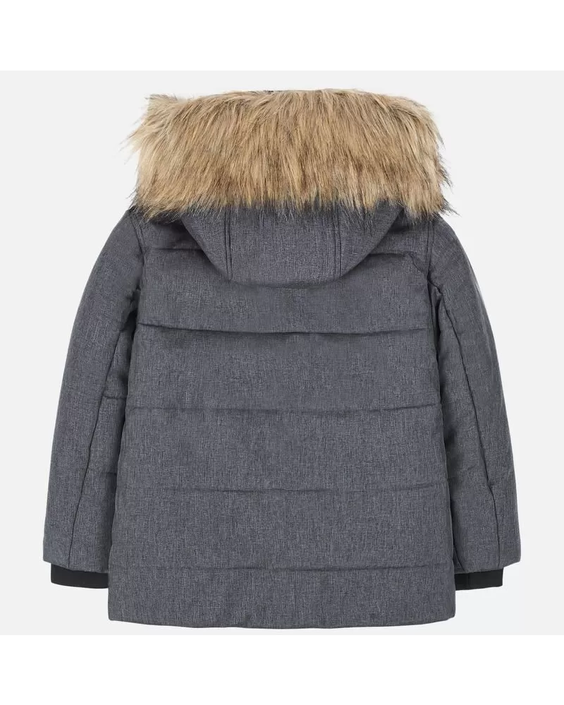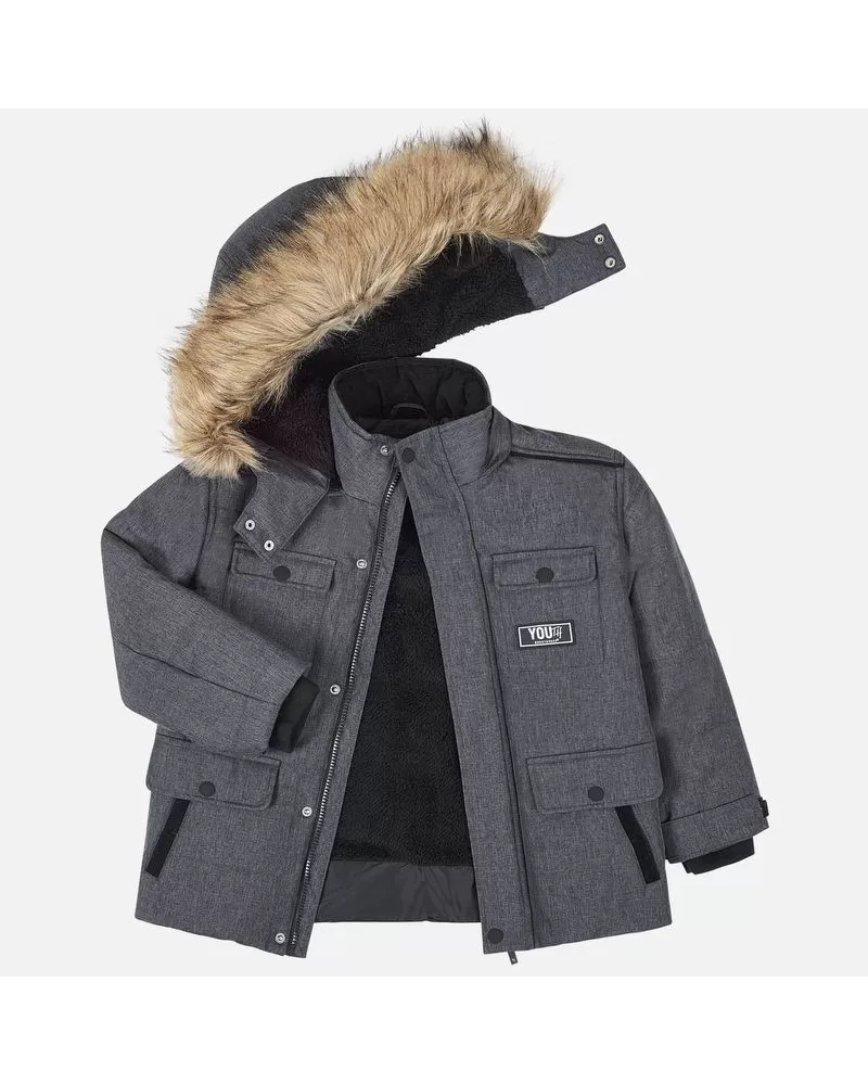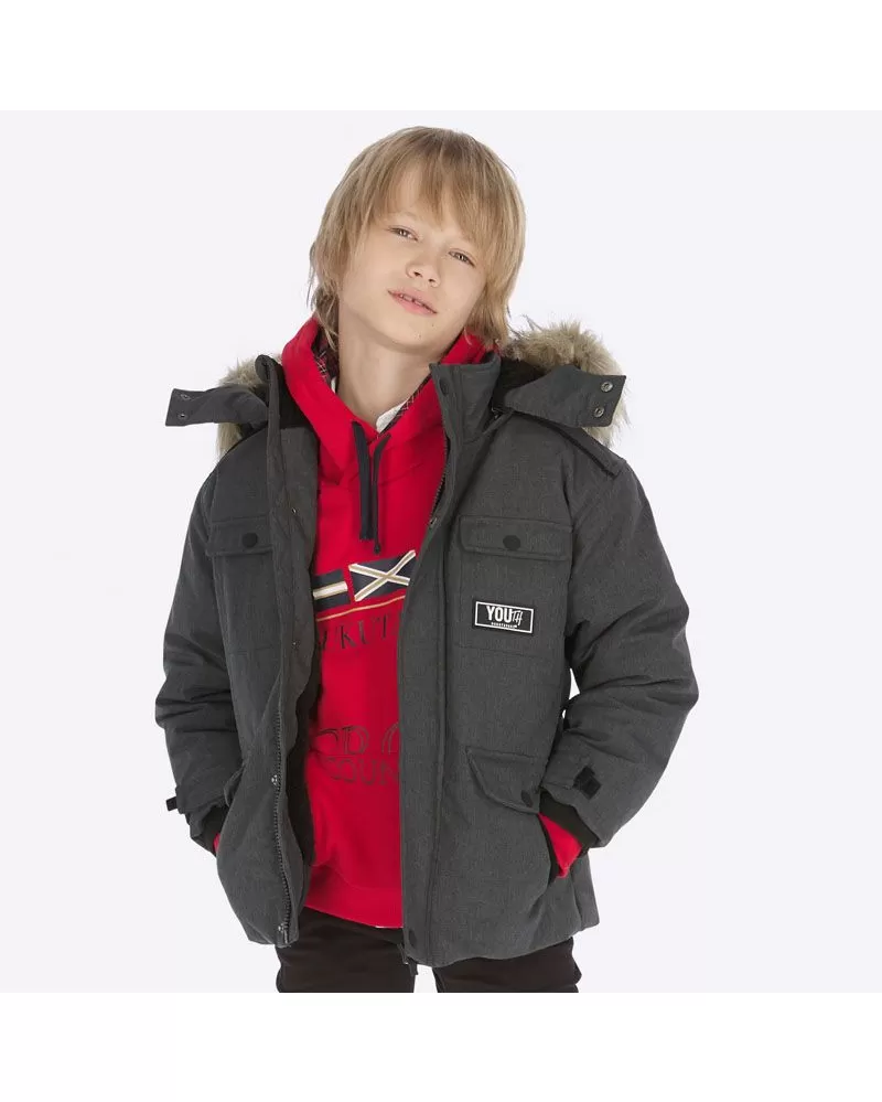 Krásná zimní bunda pro kluka od kvalitní španělské značky MAYORAL. Pěkný design - bunda s odepínací kapucí a kožíškem. Materiál: 100% polyester Celý popis